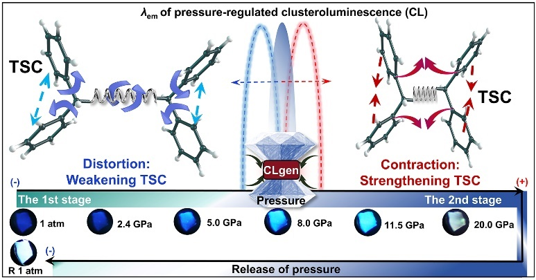1. 在一些非共轭分子中,电子云能够通过非共价键的空间离域重叠,实现簇集状态下的可见光发射。这种非传统的发光性质,被定义为簇发光。团队通过高压极端环境精确调控系列四苯基烷烃分子的空间共轭效应,引起簇发光的不同响应,实现发光颜色的有效调节及发光强度显著增强。研究聚焦空间共轭作用机制,揭示材料结构-性质关系,明确调控规律,识别影响空间共轭与簇发光响应的关键结构因素。利用压力世界杯体育官方网站程成功解锁弱作用基发光材料的发光潜能,为构建高效的弱作用基发光材料提供了新的策略。相关研究成果以“Pressure-Engineered Through-Space Conjugation for Precise Control of Clusteroluminescence(基于压力世界杯体育官方网站程改变空间共轭以实现簇发光的精准调控)”为题,发表在期刊《Angewandte Chemie International Edition》(《德国应用化学》,中科院一区,影响因子16.1)上。2023级硕士研究生王亚云为论文第一作者,聊城大学王凯教授、李茜教授与浙江大学张浩可教授为共同通讯作者,聊城大学为第一署名单位。