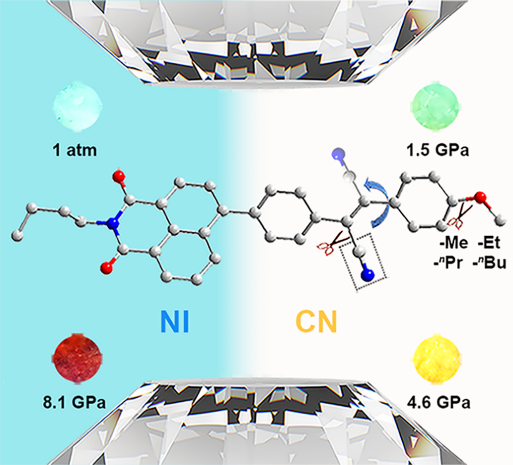 2. 刺激响应型有机智能发光材料的在发光器件、传感、信息防伪加密等领域具有广泛的应用前景。控制分子精细结构,提升力敏发光位移,一直是该领域的重要议题。团队采用萘酰亚胺和氰基二苯乙烯制备系列给-受体力敏智能发光分子。系列材料在宽达10GPa的压力范围内,展现出了显著的荧光颜色变化。同时,利用区域选择性氰化进一步实现精确的分子构型调控,有效地扩大荧光峰位的移动速率,促进材料力敏应用。该研究不仅揭示了有机给-受体分子的压致变色机制,还为设计、合成具有优异性能的力敏有机发光材料提供了新方法。相关研究成果以“Developing Piezochromic Luminescent Materials via Regioselective Cyanation of Naphthalimide Cyanostilbene Derivatives(利用萘二酰亚胺氰基联苯衍生物的选择性氰化开发压致变色荧光材料)”为题发表在期刊《Materials Chemistry Frontiers》(《材料化学前沿》,中科院二区,影响因子6.0)上。2022级硕士研究生贾浩为论文第一作者,聊城大学李茜教授、李磊教授与安徽大学王宬元教授、杨家祥教授为共同通讯作者,聊城大学为第一署名单位。
