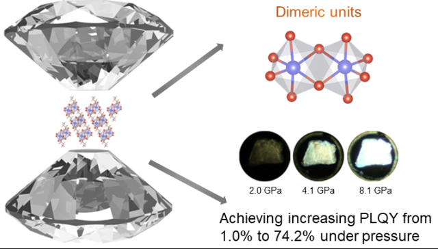 3. 在各种构型的金属卤素配位基元中,八面体二聚体单元具有较大的结构灵活性。基于此,团队针对零维金属卤素钙钛矿(C3H12N2)2Sb2Cl10进行高压研究。一方面利用压致二聚体构型扭曲增强电—声耦合效应,促进激子自陷,增强能量势垒和活化能,使更多的自陷态激子被束缚在三重态,并进行辐射跃迁。另一方面,利用压致激发态弛豫受限引起非辐射跃迁的显著降低,促进荧光效率的提升。高压下,材料的荧光量子产率从<1.0%显著提高到了74.2%,并显示出强烈的宽带白光发射。这项世界杯体育官方网站作以“Pressure-Triggered Intense Natural White Emission via Controllable Distortions of Antimony Chloride Dimers(压致可控氯化锑二聚体畸变实现强白光发射)”为题发表在期刊《Chemical Engineering Journal》(《化学世界杯体育官方网站程杂志》,中科院一区,影响因子13.3)上。2022级硕士研究生尤照江为论文第一作者,聊城大学李茜教授、王凯教授和泰山学院陈君教授为共同通讯作者,聊城大学为第一署名单位。