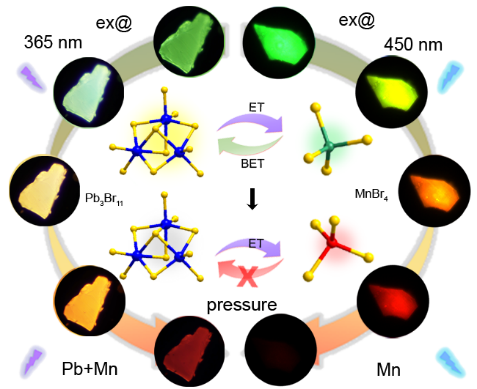 5. 零维金属卤素钙钛矿的光敏基元能够在分子尺度完全为阳离子所间隔。基于此,团队将零维研究体系向多光敏基元过度,探索不同光敏基元间的能量转移在高压下的响应行为,发展金属卤素钙钛矿的多重荧光特性。零维金属卤素钙钛矿(C9NH20)9[Pb3Br11](MnBr4)2具备[Pb3Br11]5−和[MnBr4]2-两种不同的光敏结构基元。随着压力的升高,[Pb3Br11]5−结构刚性增强且构象畸变被抑制,有效改变了自陷态激子的发射平衡,导致对应自陷态激子荧光峰的异常蓝移。同时,[MnBr4]2-的结构收缩显著增强了Mn2+的约束效应,有效提升了其本征发光效率。值得关注的是,在激发光能量足够高的条件下,[Pb3Br11]5-可以作为“天线”来进一步增强Mn2+的发光强度,引起材料明显的激发依赖荧光现象。相关研究成果以“Resolving multiple emissions of zero-dimensional heterometallic halide hybrid via pressure-triggered antenna effect(压力诱导天线效应解析零维双金属卤化物的多重发光特性)”为题发表在期刊《Materials Research Letters》(《材料研究快报》中科院一区,影响因子8.6)上。2022级硕士生孟新淼为论文的第一作者,聊城大学李磊教授、王凯教授和李茜教授为共同通讯作者,聊城大学为第一署名单位。