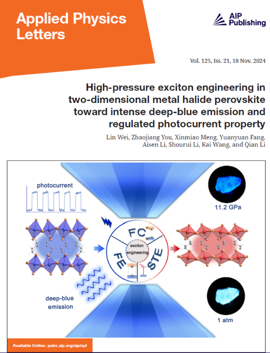 6. 二维金属卤素钙钛矿中兼具高维与低维金属卤素钙钛矿的不同结构特性。针对二维金属卤素钙钛矿10% Pb²⁺掺杂BDACdBr₄(BDA:1,4-丁二胺)体系,团队通过高压手段调控激子行为,有效优化材料的光致发光和光电流特性。高压下,相互作用较弱的层间结构被显著收缩,电-声耦合作用降低且激子结合能减小,限制激子的系间窜跃,更多光生激子以自由激子形式返回基态。材料自陷态激子发光逐渐减弱,且自由激子发光逐渐增强。随着压力继续升高,常压结构转为高压相,激子结合能的进一步降低使得激子一方面以自由激子形式辐射跃迁,引起强烈深蓝光发射。同时,光生激子还会发生解离,促进自由电荷迁移引起光电流效应的增强。相关研究成果以“High-pressure exciton engineering in two-dimensional metal halide perovskite toward intense deep-blue emission and regulated photocurrent property(二维金属卤素钙钛矿的高压激子调控:强深蓝光发射与光电流性能调制)”为题发表在期刊《Applied Physics Letters》(《应用物理快报》,中科院二区,影响因子3.5)上,并被选为封面文章。2023级硕士研究生魏林为论文第一作者,聊城大学王凯教授、李茜教授和中国世界杯体育官方网站程物理研究院流体物理研究所李守瑞副研究员为共同通讯作者,聊城大学为第一署名单位。