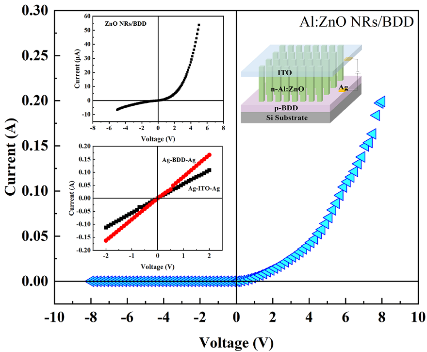 ZnO纳米材料由于其较低的激光阈值和较高的光学效率,被视为光电应用领域的可行候选材料。近年来,不同p型衬底材料与ZnO纳米材料相结合制备的异质结结构被广泛应用于光电子器件等领域。与硅(Si)、氮化镓(GaN)等传统衬底材料相比,掺硼金刚石(BDD)具有高导热性、宽禁带(5.47eV)、高击穿电压(~107V/cm)、高电子空穴迁移率(2400cm2/(V·s))、化学稳定性和室温抗辐射性能等优异性能。因此,将ZnO纳米材料与BDD结合形成的异质结器件在高温、高频和高功率等恶劣环境下表现出耐用可靠的光电性能。为了进一步调控优化该异质结系统,研究团队通过对ZnO掺杂铝元素,改进了ZnO纳米棒/p-BDD异质结的光致发光和电学性质。n-Al:ZnO纳米棒/p-BDD异质结光致发光强度显著增强,且紫外发射峰出现明显蓝移。异质结I-V特性曲线表现出较好的整流特性(如图1所示),在5V下具有838的高整流比,比n-ZnO纳米棒/p-BDD异质结的整流比(19.3)高40倍以上。在5V正向偏压下,正向电流高达67.5mA,是n-ZnO纳米棒/p-BDD异质结的1300倍以上。通过构建能带结构模型(如图2所示),探讨了该异质结载流子输运行为的物理机制。本研究世界杯体育官方网站作为未来耐高温、高频等恶劣环境下金刚石基纳米光电器件的开发提供了新的设计和应用思路。