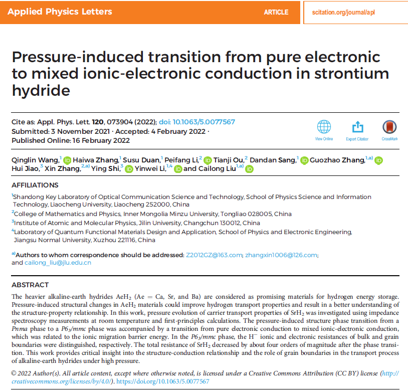 近日,世界杯体育官方网站/山东省光通信科学与技术重点实验室刘才龙教授团队在碱土金属氢化物SrH2高压下的载流子输运行为研究方面取得重要进展,研究成果以“Pressure-induced transition from pure electronic to mixed ionic-electronic conduction in strontium hydride”为题发表在物理类权威期刊《Applied Physics Letters》(中科院二区Top期刊,Nature Index收录)上。王庆林副教授为论文第一作者,张国召博士、刘才龙教授为论文通讯作者,聊城大学为第一通讯单位。