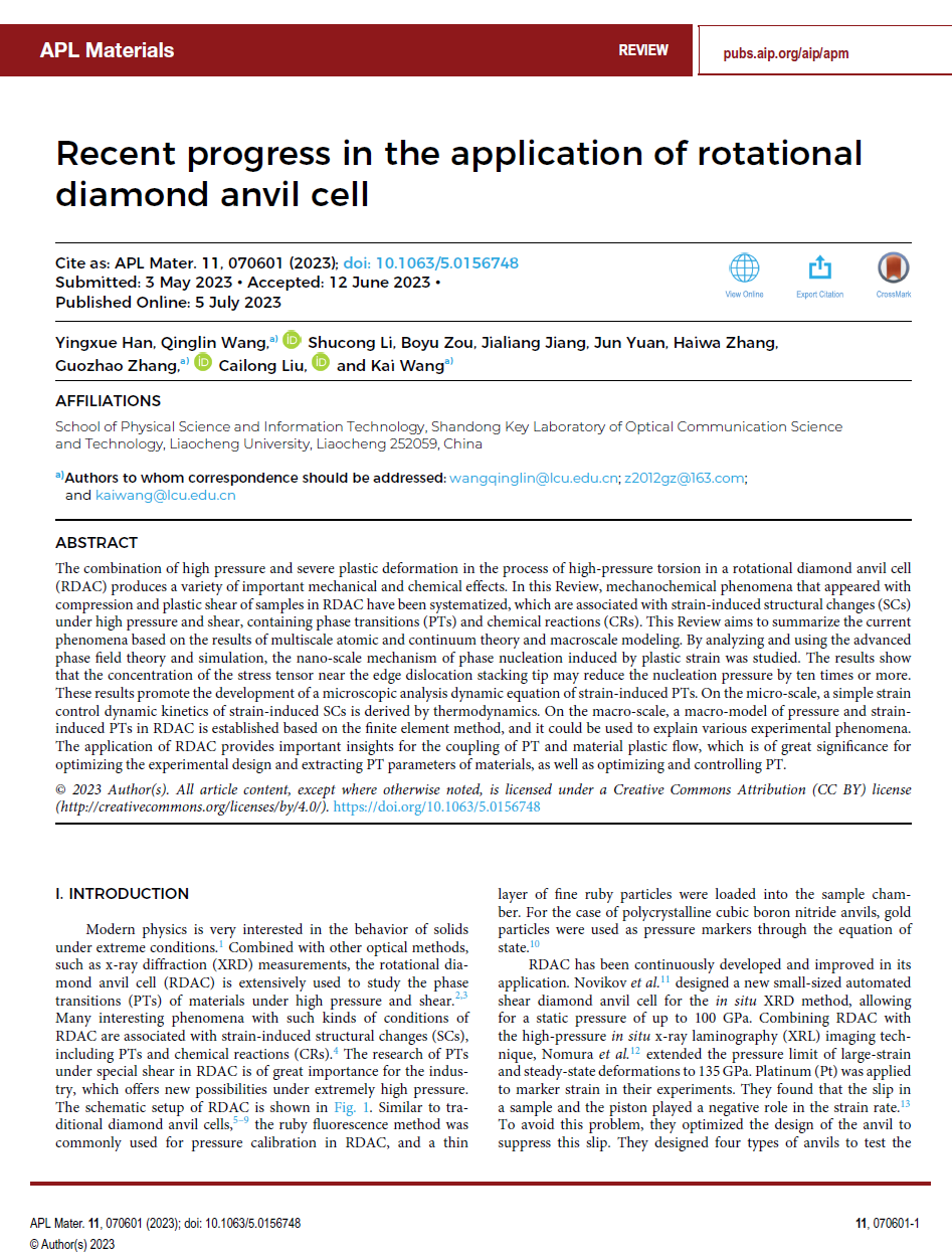 近日,世界杯体育官方网站泰山学者青年专家王凯教授团队指导本科生在《APL Materials》(中科院二区,影响因子6.1)上发表了题为“Recent progress in the application of rotational diamond anvil cell(旋转金刚石对顶砧技术的最新应用进展)”的综述文章。2020级物理学专业本科生韩莹雪为文章第一作者,王庆林副教授、张国召博士、王凯教授为共同通讯作者,刘才龙教授、张海娃博士,研究生邹博宇、姜家梁,本科生李树聪、袁骏共同参与了该世界杯体育官方网站作,聊城大学为唯一署名单位。