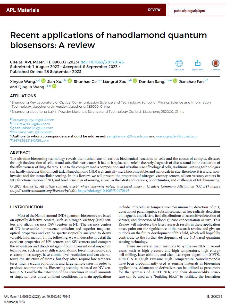 “Recent Applications of Nanodiamond Quantum Biosensors(纳米金刚石量子生物传感器的最新应用)”总结了近年来纳米金刚石量子生物传感器在多个领域的应用进展,例如纳米金刚石量子生物传感器在生物体内精细结构内的温度监测,磁场分布及自由基浓度的检测,病毒的超灵敏检测以及葡萄糖浓度的检测等。此外,文章对纳米金刚石量子生物传感器在其他领域中的进一步应用进行了展望,提出了新的见解。例如,纳米金刚石量子生物传感器可实现快速精准地检测较低浓度的病毒,有利于提高今后对大型传染病等危机的应对能力等。2020级物理学专业本科生王鑫悦为文章第一作者,2020级物理学专业本科生徐健参与了部分世界杯体育官方网站作,桑丹丹副教授、王庆林副教授为文章通讯作者,聊城大学为第一署名单位。