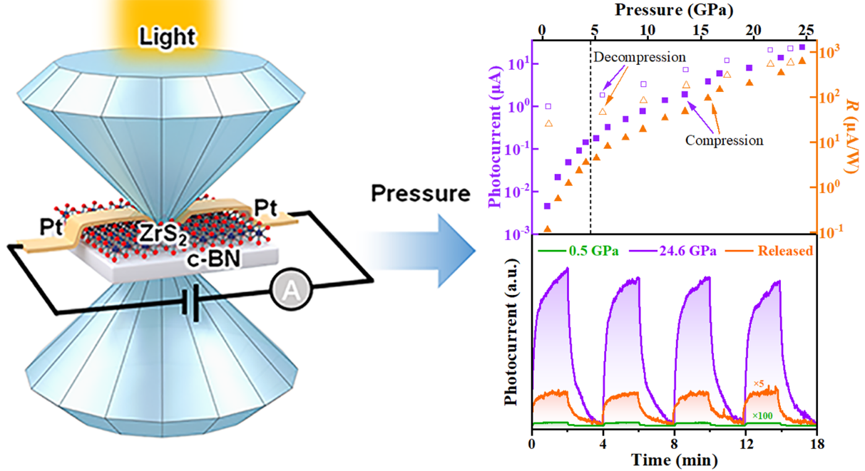 压力可以通过调控材料的晶体结构,进而实现对材料光电性能的调控。ZrS2作为一种典型的过渡金属硫族化合物(TMDs),相比于被广泛研究VIB族TMDs,理论上具有更优异的电子和光电性质,且在光电探测器、场效应晶体管和传感器等领域具有巨大应用潜力。作者们利用基于金刚石对顶砧的高压原位光电流、拉曼散射光谱、交流阻抗谱、吸收光谱的测量手段和理论计算方法相结合系统地研究了高压下层状ZrS2的光电性质。研究表明,加压过程中,随着压力的增加,层状ZrS2的光电流值持续增加,最终其光电流实现了三个数量级的增加;且拥有高光电响应的ZrS2高压相可以截获至常压。ZrS2的晶体结构、电输运性质和禁带宽度也均受压力调控。此项研究为科研世界杯体育官方网站作者通过高压合成性能优异的TMDs光电功能材料提供了新的思路,对未来光电器件性能的提升具有重要意义。我院2021级硕士生王娜和张国召博士为共同第一作者,冯振豹副教授、张海娃博士和刘才龙教授为共同通讯作者,聊城大学为第一署名单位。