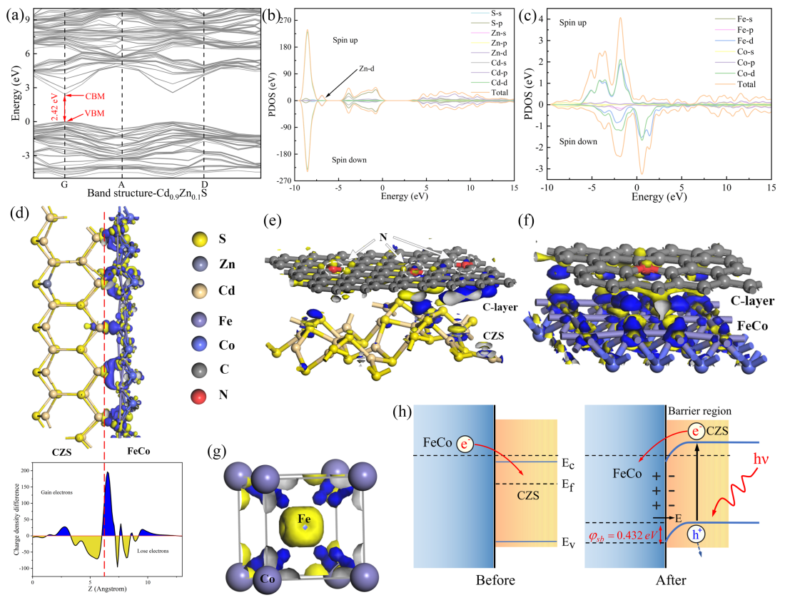 N原子掺杂石墨碳层包裹的磁性FeCo纳米材料与其它半导体材料形成异质结的过程中,电子转移机理的解释是一个难点。本文首次提出利用肖特基势垒理论解释这个问题,有效地阐明了电子转移过程的机制。Cd0.9Zn0.1S(CZS)作为一种极具潜力的可见光活化光催化剂,但其受到光激发载流子分离的慢动力学的限制。基于第一性原理的密度泛函理论(DFT)计算表明,引入掺氮石墨碳(FC@NC)可以有效降低氢的吸附自由能,从而加速CZS的氢反应动力学。在理论预测的支持下,通过沉淀和煅烧成功制备了磁性FC@NC纳米颗粒,然后通过超声自组装和煅烧,再与CZS结合,形成了FC@NC/CZS复合光催化剂。基于实验结果和DFT计算,提出了利用肖特基异质结增强FC@NC/CZS复合材料光催化活性的可能机理。该世界杯体育官方网站作是一个具有代表性的理论指导材料合成的成功案例。