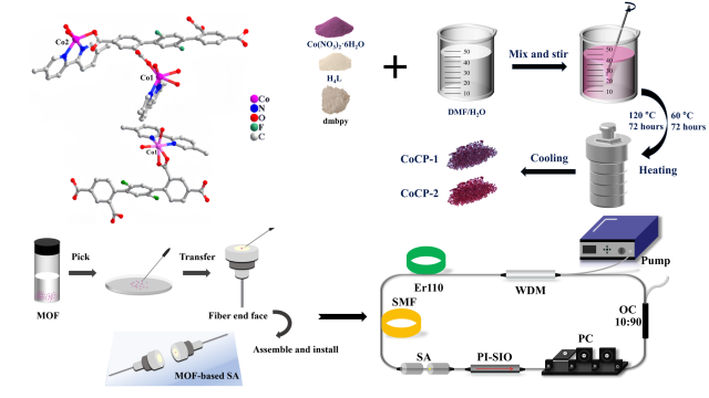 团队通过水热合成法制备了CoCPs超分子异构体,将其作为可饱和吸收体应用于掺铒光纤激光器。通过调控温度改变晶体结构,实现了调制深度的可调性,为超快激光器的性能优化提供了新思路。相关研究发表于《Journal of Alloys and Compounds》(《合金与化合物杂志》、中科院二区,影响因子5.8)。2023级硕士研究生刘晨月为论文第一作者,聊城大学王朋朋副教授、王素娜教授与朱存光副教授为共同通讯作者,聊城大学为第一署名单位。