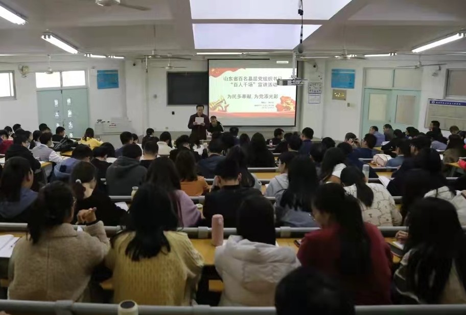 为深入学习宣传贯彻习近平新时代中国特色社会主义思想,充分发挥理论宣讲带动作用,推动党史学习教育走深走实,10月28日下午,山东省基层党组织书记“百人千场”宣讲活动走进世界杯体育官方网站,东昌府区道口铺街道仙庄村党支部书记孙乐文作专题宣讲,世界杯体育官方网站教世界杯体育官方网站党员、学生党员共170余人于西校区十一号教学楼A504教室聆听了此次宣讲活动。本次宣讲由学院党总支副书记、副院长吴成主持。