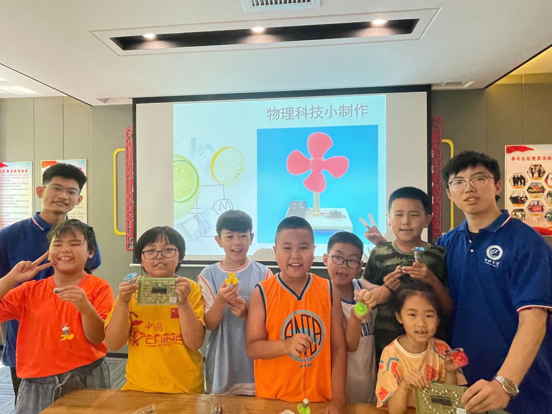 皮亚杰曾说“知识来源于动作,而非来源于物体”。志愿服务队在下午开展了科学实验课堂,由团队成员教孩子们制作小风扇。首先成员们简单的向孩子们介绍了其制造原理,之后发放制作器件,由孩子们自主完成组装。在制作过程中,团队成员们进行场内指导,解决孩子们遇到的问题,例如分不清电池正负极、马达引脚接反,在成员们的帮助下每位小朋友都成功制作出了小风扇,完成了科技实验。