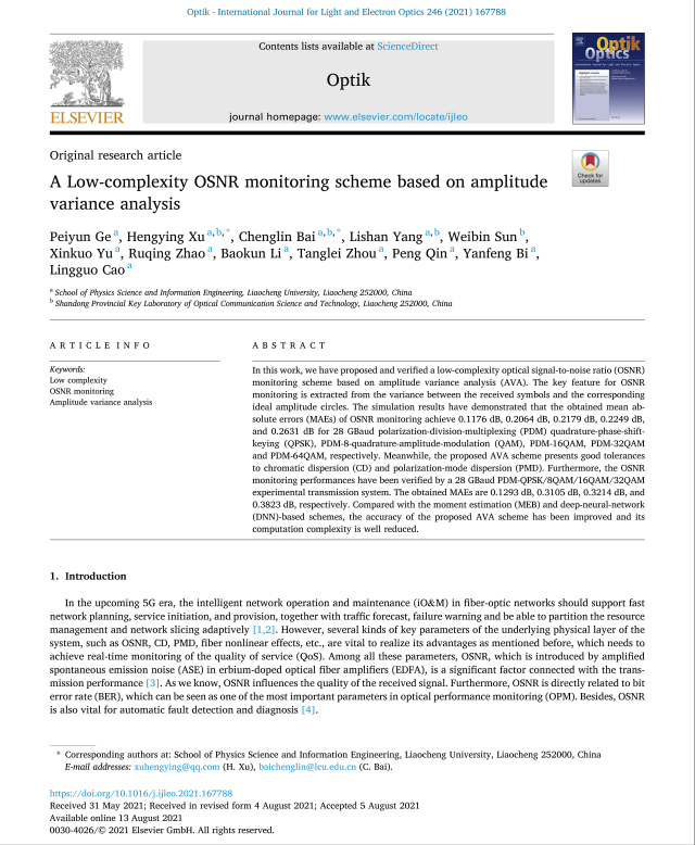 第二、2021年8月份,我院2018级通信世界杯体育官方网站程专业本科生葛佩云同学以第一作者身份在光学领域高质量科技期刊《Optik》(《光学》)发表题为”A Low-complexity OSNR monitoring scheme based on amplitude variance analysis”(“一种基于幅度方差分析的低复杂度光信噪比监测方案”)的研究论文,我校许恒迎教授、白成林教授为通讯作者,聊城大学为第一通讯单位。
