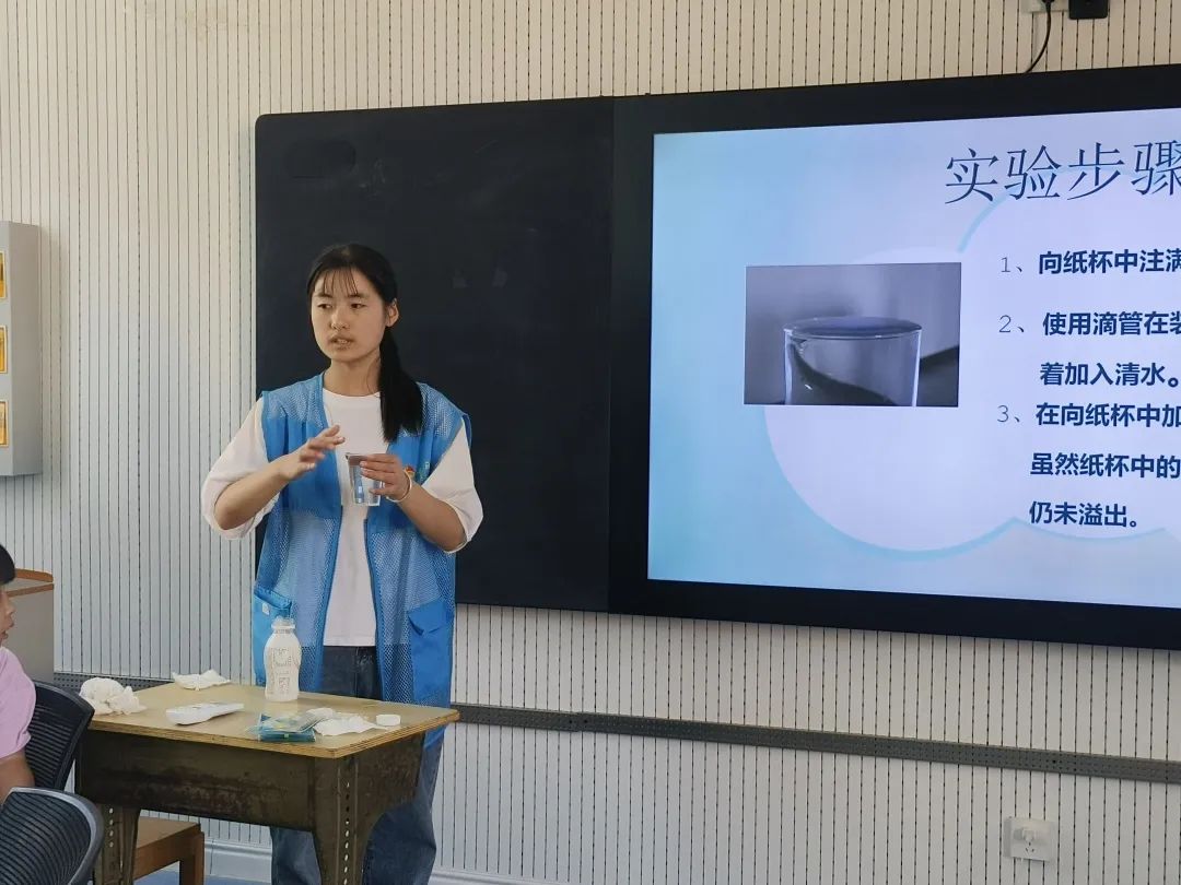 本次科技微课堂走进三年级一班和三年级二班,共有75名小朋友听课。授课过程中,志愿者们结合生活中的物理现象,向小朋友们讲解有关水的张力的知识,并通过简单有趣的实验,为小朋友们呈现了一幕又一幕的“神奇现象”,引起了小朋友们的浓厚兴趣。面对志愿者们提出的问题,他们积极思考,踊跃回答。实验环节,在志愿者们的耐心指导下小朋友们完成了四个有关水的张力的小实验,让小朋友们对水的张力有了更加深入的了解,现场气氛十分活跃。