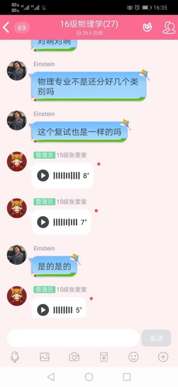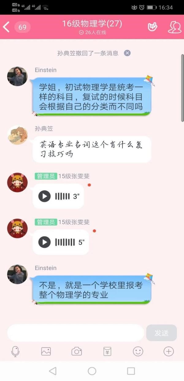15级学长王鑫倾怀解囊,帮助大家解决考研中的心理问题,传授考研复习经验。王鑫学长建议制定计划,有目的进行学习,防止因长时间在家产生的懒惰心理影响学习效率。针对多数同学提出的如何面对面试老师的问题,王鑫学长结合自身经历,提出实事求是、表现自己积极的求学态、引导老师询问自己擅长方向三点建议。并鼓励学生主动去介绍自己的项目,与面试老师畅谈。15级的张雯婓通过语音的方式,进行了简单的自我介绍。随后从物理学的方面,详细介绍了考研需要注意的问题。对于专业方面,张雯斐建议应根据自己所报考的学校、联系的导师,查询到有关的资讯,灵活地确定发展方向。最后她强调在复试中最重要的一点,就是不要紧张,要有自信心,要相信自己。