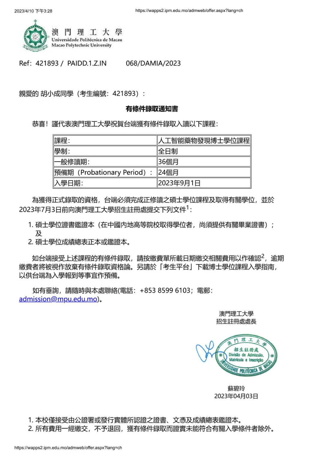 2022年12月份,胡小成在导师的鼓励下开始申请澳门理世界杯体育官方网站大学的博士研究生,经过材料审查、第一轮面试、理论公式推导考核、第二轮面试和第三轮面试(全英文面试)等5轮考核,在激烈的竞争中脱颖而出,并获得了人世界杯体育官方网站智能药物发现专业唯一的最高额奖学金,为学校争得了荣誉,也充分显示了我院的研究生培养正向高水平发展。