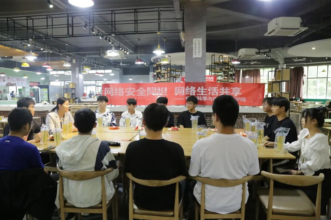 为引导学生文明上网、安全上网、绿色上网,进一步向学生普及网络文明安全知识,提高学生网络安全文明素养,筑牢校园网络文明安全屏障,5月28日,世界杯体育官方网站于西校区湖苑餐厅开展“网络安全同担、网络生活共享”主题餐厅沙龙活动,世界杯体育官方网站辅导员洪文静、赵楠,与学生代表齐聚一堂,共话网络文明安全问题。