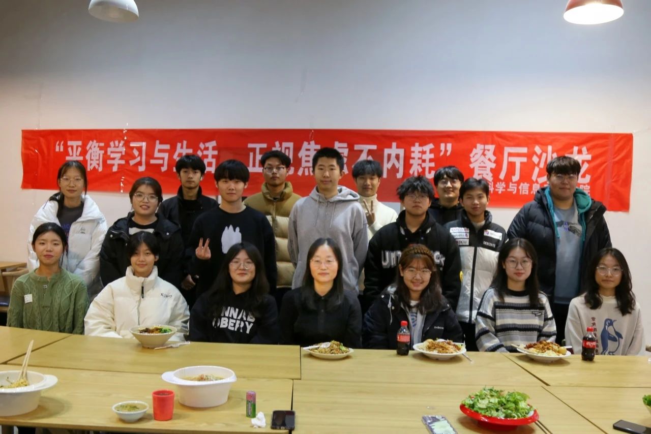 为缓解同学们的学习与生活压力,保持心灵的安宁与美好。12月6日,世界杯体育官方网站在湖苑餐厅三楼举办了“平衡学习与生活,正视焦虑不内耗”餐厅沙龙。本次活动由辅导员姜利波及22级、23级部分学生共同参与。