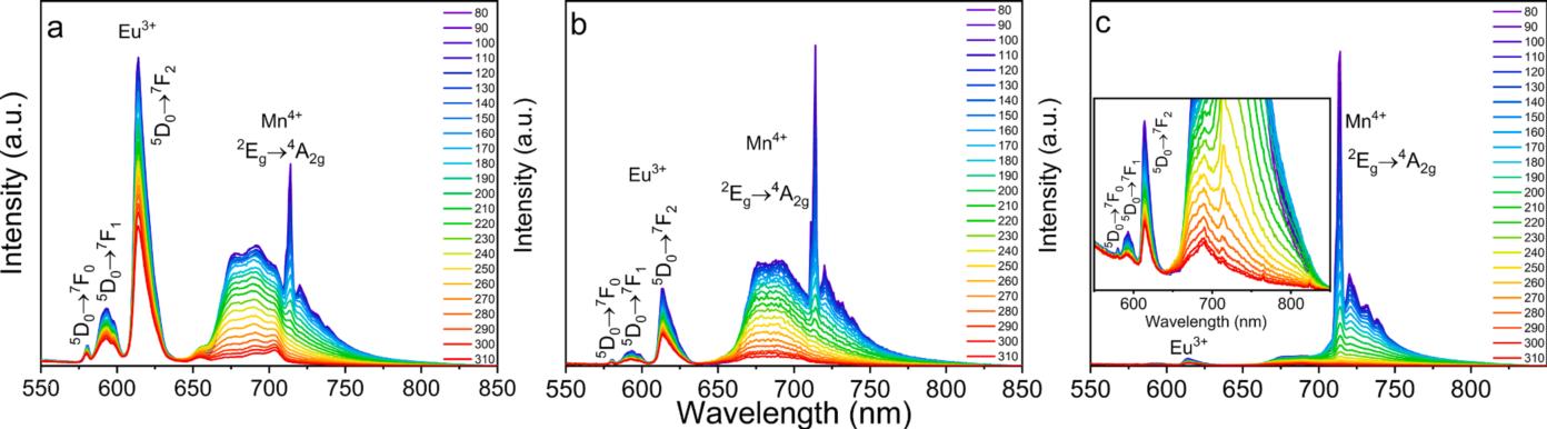由于具有响应速度快、测量精度高、可远距离非接触测量等优点,基于荧光强度比的荧光测温法受到人们广泛关注。在高发光效率的前提下,如何提高荧光温度计的灵敏度成为人们研究的重点。针对该问题,课题组研究人员提出了电荷补偿和双相共生长协同作用提高荧光温度计性能的方法,利用该方法可有效提高了晶体的发光效率和温度灵敏度。第一项世界杯体育官方网站作(《Influence of charge compensation on the photoluminescence and temperature sensing of zinc titanate composites》)中,研究人员分别在ZnO-TiO2混合相、ZnTiO3钛铁矿-钙钛矿混合相以及TiO2-Zn2TiO4混合相中掺杂了Li+,通过Li+补偿Eu3+与Ti4+和Zn2+的电荷差,提高了晶体的发光效率,并利用混合相中晶体场的差异,提高了晶体的温度灵敏度,解决了电荷平衡中高发光效率低灵敏度的问题。第二项世界杯体育官方网站作(《Dual-mode optical thermometer based on fluorescence intensity ratio of Eu3+/Mn4+ co-doping zinc titanate phosphors》)中,研究人员在第一项世界杯体育官方网站作的基础之上,制备了具有钛铁矿和钙钛矿同质异构的ZnTiO3纳米晶体,利用Mn4+在钛铁矿和钙钛矿晶格中的能级跃迁差异,实现了3.2 %/K的高相对灵敏度和0.01K的温度分辨率。上述成果对新型高灵敏度荧光温度计的设计具有一定的指导意义。