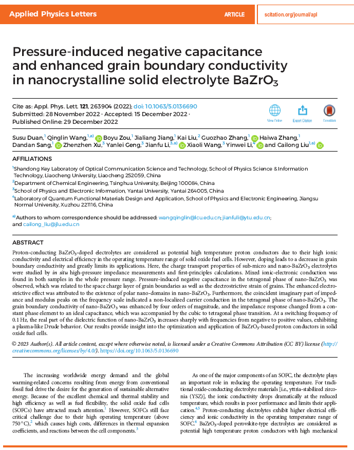 近日,世界杯体育官方网站刘才龙教授团队在固体氧化物燃料电池(SOFC)固态电解质BaZrO3在高压强作用下的载流子输运行为研究方面取得重要进展,研究成果以“Pressure-induced negative capacitance and enhanced grain boundary conductivity in nanocrystalline solid electrolyte BaZrO3( 纳米晶固体电解质BaZrO3的压致负电容和增强的晶界电导率)”为题发表在物理类权威期刊《Applied Physics Letters》(《应用物理快报》为中科院二区Top期刊,Nature Index收录)上。2020级物理学专业硕士生段素素为文章第一作者,王庆林副教授、刘才龙教授为论文通讯作者,聊城大学为第一通讯单位。
