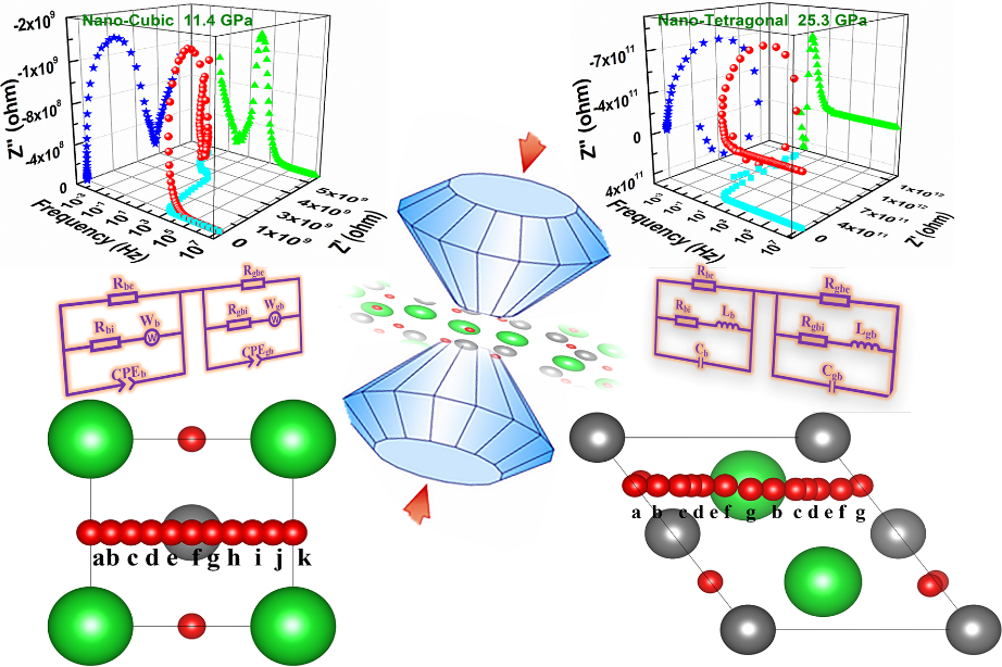BaZrO3作为质子传导型固态电解质,因其较高的离子电导率而备受关注。然而,晶界电导率低限制了其应用。压力可以有效的调控BaZrO3材料中O2-离子的输运性能,从而更好地理解其构效关系。本世界杯体育官方网站作中,刘才龙教授团队与清华大学、烟台大学、江苏师范大学等单位合作,通过基于DAC的高压原位交流阻抗谱测量技术,结合第一性原理计算,系统研究了纳米和亚微米BaZrO3在高压下的电输运行为。研究发现,在整个压力范围内,两种样品都存在离子-电子混合传导。值得注意的是,在纳米BaZrO3的四方相中发现了压力诱导的负电容现象,这与晶界的空间电荷层和晶粒的电致伸缩应变有关。高压下,纳米BaZrO3的晶界电导率提高了4个数量级,且伴随着相变其阻抗响应从常相角元件转变为理想电容。纳米BaZrO3的介电常数实部在0.1Hz处随频率急剧增加,且从负值转变为正值,表现出类等离子体的Drude行为。这一研究结果有助于更好地理解质子传导型固态电解质高压下的导电机理,并为BaZrO3基SOFC载流子输运研究及介电性能的优化设计提供了新思路。