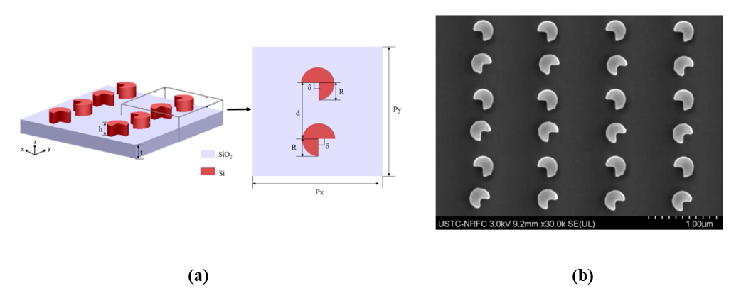 图1. (a)所设计超结构的示意图;(b)制备样品的SEM图
