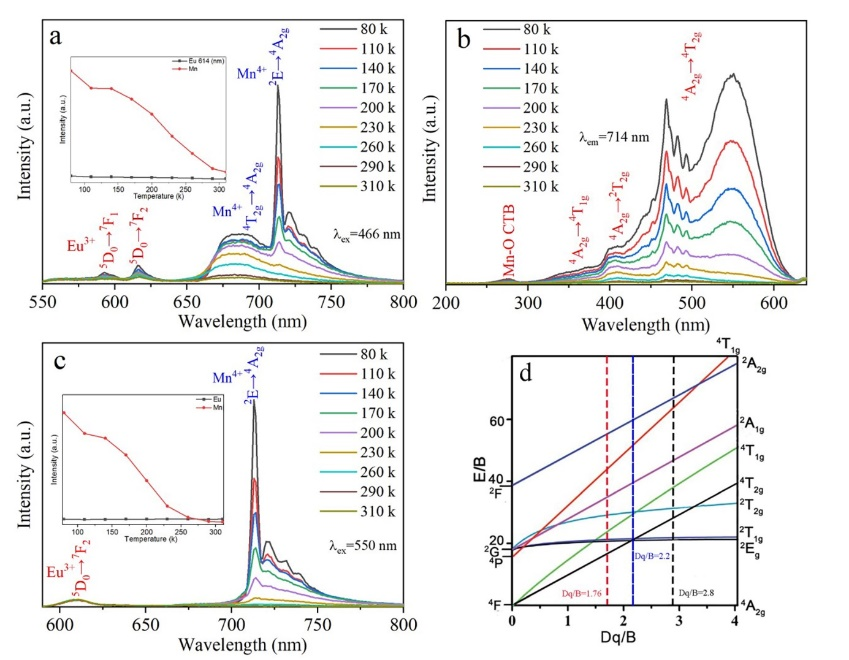界面扩散是影响光电材料与器件物理特性的重要因素,也是当前科学研究中的难点和热点。混合荧光材料具有低成本、灵敏度高等特点,但是针对异质或异构晶粒界面在高温下的扩散对器件温度灵敏度影响的研究较为匮乏。课题组研究人员在SrTiO3:Eu3+-ZnTiO3:Mn4+体系中,利用Eu3+的电偶极子跃迁5D0-7F2和磁偶极子跃迁5D0-7F1对晶体场变化敏感性的差异,对该结构高温下离子的界面扩散过程、以及界面扩散对荧光温度计灵敏度和稳定性的影响进行了系统的研究。通过晶体场的计算,Mn4+在钙钛矿结构中处于弱晶体场,其发光为4T2g→4A2g能级跃迁,而在钛铁矿结构中为强晶体场,其发光为2Eg→4A2g能级跃迁,其荧光强度的温度差异保证了3.3 %K-1的高温度灵敏度和0.02 K的高温度分辨率,界面扩散增加了Mn4+的局域非对称性,使最高温度灵敏度由3.1 %K-1增加为3.3 %K-1,该成果为异质或异构高灵敏度荧光温度计的优化提供了理论依据和技术支持。