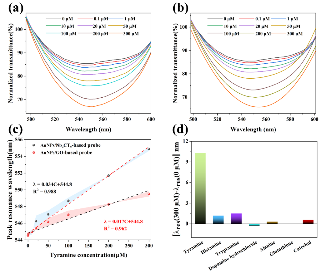 在这项世界杯体育官方网站作中,研究人员开发了一种基于Nb2CTx MXene增强的双S锥光纤(DSF)结构LSPR传感器探针,用于实现酪胺浓度检测。与传统的锥形光纤相比,DSF结构可以在传感区域提供更强的倏逝场以激发LSPR。研究者们分别利用金纳米粒子/氧化石墨烯/酪氨酸酶(AuNPs/GO/酪氨酸酶)和AuNPs/Nb2CTx/酪氨酸酶在传感器区功能化,开发了两种不同DSF结构的探针,并对比了不同酪胺浓度下传感器的峰值共振波长漂移量。实验结果表明,Nb2CTx增强的传感器探针具有更高的灵敏度和更好的线性拟合度,在0-300 μM酪胺浓度范围内,探针的灵敏度和检测限分别为34 pm/μM和0.352 μM。本世界杯体育官方网站作为增强LSPR作用和提高LSPR传感器灵敏度提供了研究平台。