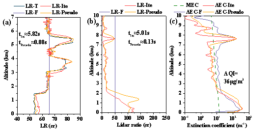 气溶胶激光雷达比是气溶胶光学特性反演的重要参数,影响着气溶胶光学特性反演精度和大气中气溶胶类型的辨识精度。在这项世界杯体育官方网站作中,研究人员提出了一种具有一定普适性的伪常数反演气溶胶雷达比廓线的方法。所提出的伪常数方法避免了畸变消光系数廓线的引入,无需设置气溶胶雷达比值的变化范围,也无需人为控制迭代参数。理论仿真和实验分析均表明伪常数法可获得更准确的气溶胶雷达比廓线,同时可显著提高信号处理效率(每组信号的处理时间从约5秒改进至约0.1秒),并能在一定程度上提高气溶胶类型的识别精度。