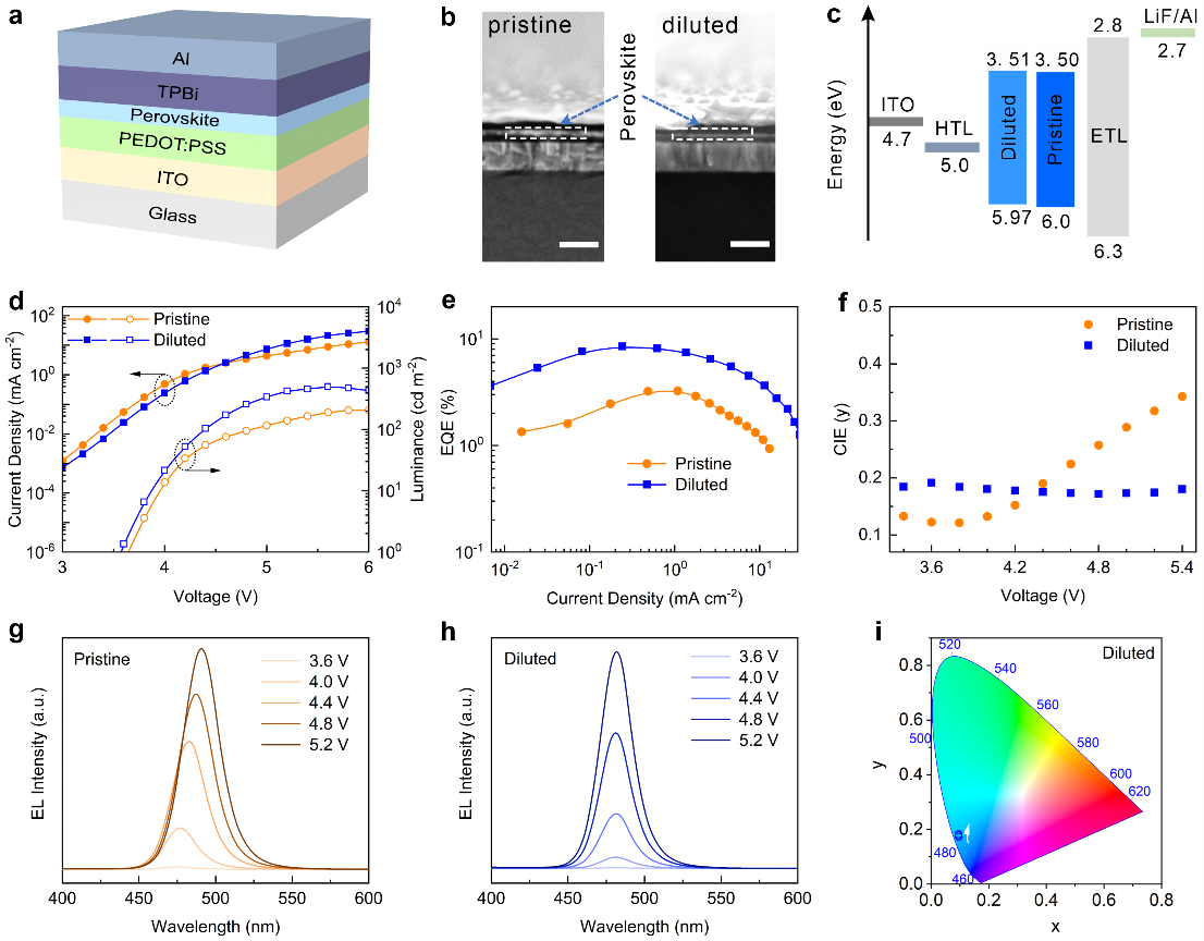 金属卤化物钙钛矿具有荧光量子产率高、可溶液法制备、色纯度高等优点,在照明和高性能显示等领域具有广阔的应用前景。近年来,红光、绿光钙钛矿发光二极管(PeLEDs)器件外量子效率屡创新高,几乎已经达到了其材料的光耦合极限。然而,较差的光谱稳定性以及外量子效率较低仍然制约着蓝光PeLEDs的发展。