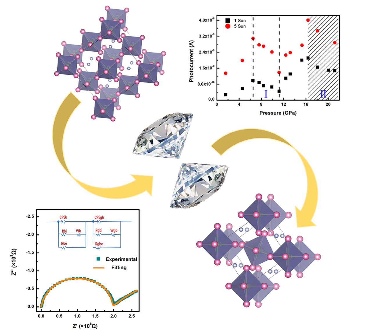 压力在调控卤化物钙钛矿太阳电池材料的光响应和电输运性质中扮演者重要的角色。(NH4)2SeBr6作为非铅卤化物双钙钛矿材料,避免了有毒铅元素的使用,是清洁光伏和光电器件的理想候选材料之一。本世界杯体育官方网站作中,作者们通过高压原位拉曼散射光谱测量实验研究发现(NH4)2SeBr6在16.0GPa发生了立方相到四方相的结构相变,通过高压原位交流阻抗谱和直流光电导测量实验研究了(NH4)2SeBr6在常压至21.2GPa的电输运和光电响应特性。研究发现,(NH4)2SeBr6的光电流随压力逐渐增强,在6.5GPa处达到第一个峰值,之后光电流值随压力的增加逐步减小,在11.2GPa出现第二次光响应增强,并在16.4GPa处达到第二个峰值。(NH4)2SeBr6在II相(四方相)的光电响应优于I相(立方相)。在整个压力区间内电子传导在(NH4)2SeBr6样品的电输运过程中起主导作用。这些研究可以更加深入地了解非铅双钙钛矿材料,对将来更好地开发钙钛矿光伏光电器件具有实际的帮助。