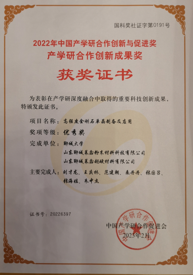 近日,中国产学研合作促进会公布了2022年产学研合作与促进奖的表彰决定,由聊城大学为第一完成单位,我院刘才龙教授团队为主导,联合山东聊城莱鑫粉末材料科技有限公司和山东聊城莱鑫超硬材料有限公司共同完成的成果“高强度金刚石单晶制备及应用”获得中国产学研合作创新成果奖优秀奖。王庆林副教授荣获产学研合作创新奖(个人)。