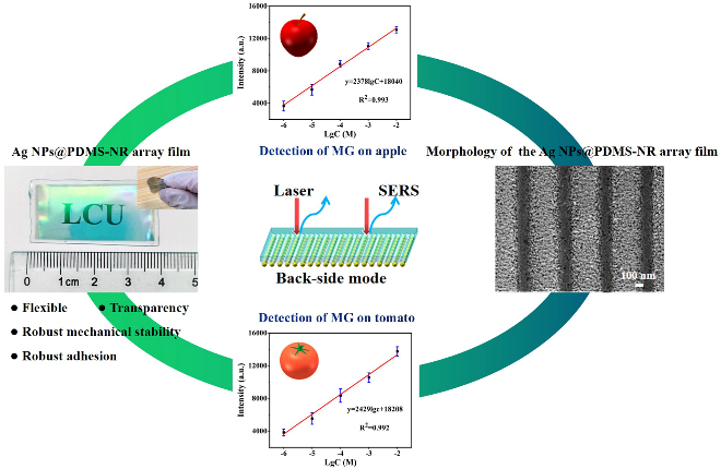 本世界杯体育官方网站作中,作者们利用氧等离子体处理及磁控溅射技术实现了大面积、柔性和透明的Ag NPs@PDMS-NR阵列薄膜的制备。研究发现,该柔性SERS基底对R6G的检测极限达到8.20×10-8 M,同时具有良好的均匀性(RSD=6.8%)和批间再现性(RSD=2.3%)。由于该SERS基底具有优异的机械稳定性和透光性,因此适合于曲面上污染物的原位SERS检测,研究结果表明,苹果皮和番茄皮中孔雀石绿的检测极限分别为1.19×10-7和1.16×10-7 M。以上研究结果表明, Ag NPs@PDMS-NR阵列薄膜在污染物的快速原位检测中具有巨大的应用潜力。