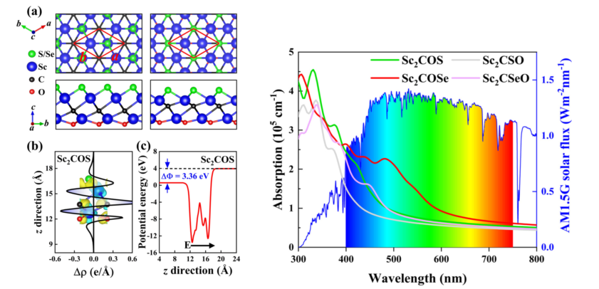 作者从理论上报道了四种候选光催化剂,即Sc2COS、Sc2CSO、Sc2COSe和Sc2CSeO。镜面不对称原子结构使Sc2COS在这些单层中具有7.53×109V/m的最大本征内建电场(EF),有利于光生电子-空穴对的分离。最大本征内建电场(EF)较小的Sc2CSO和Sc2CSeO是进行析氢反应的水分解半反应光催化剂。非常有趣的是,与顶部S或Se原子排列的C原子向下移动约0.40Å,并与底部O原子垂直排列,称之为内部垂直重构。因此,Sc2CSO(Sc2CSeO)重构转化为最大本征内建电场(EF)较大的Sc2COS(Sc2COSe),适用于光催化整体水分解。它们具有很大的光学吸收系数(高达105厘米-1)。该世界杯体育官方网站作揭示了由内部垂直重构效应引起的最大本征内建电场(EF)增强促进水分子全分解的物理机制,这为理论上设计高效光催化剂提供了可行的策略。