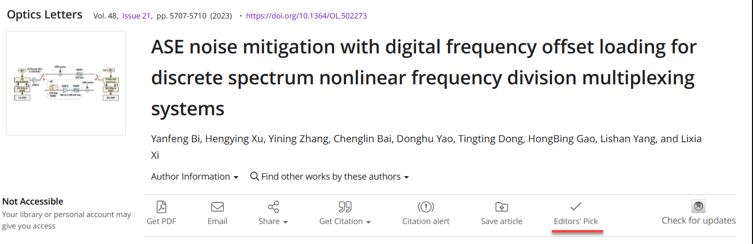 本项世界杯体育官方网站作被Optics Letters期刊评选为当期的Editor's Pick(编辑精选)文章,意味着该世界杯体育官方网站作得到了编辑部的高度认可,认为该世界杯体育官方网站作具有较高的科研价值并在DS-NFDM系统的研究领域非常具有代表性。