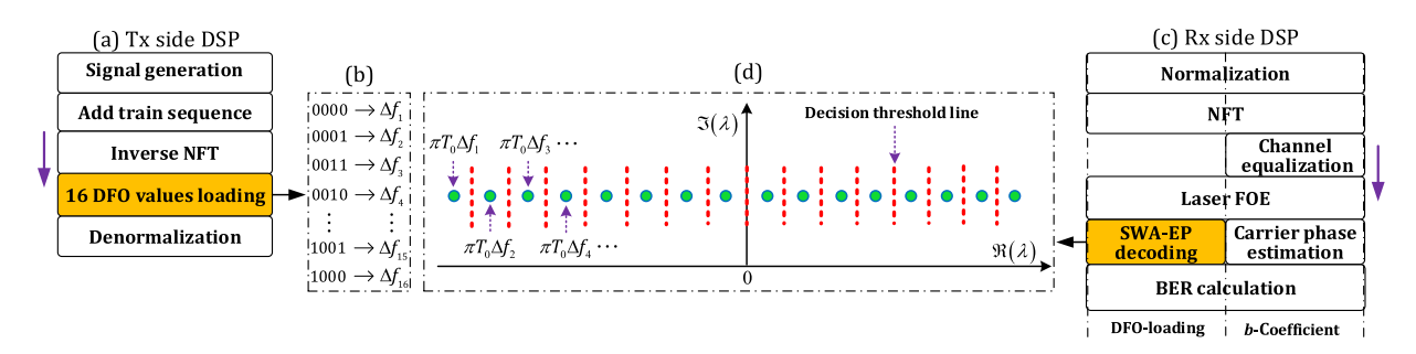 在这项世界杯体育官方网站作中,针对离散频谱非线性频分复用(DS-NFDM)系统,该研究提出了一种利用数字频率偏移加载的放大自发发射(ASE)噪声缓解方案。基于频率偏移与特征值位置之间的一对一映射关系,本研究在发射机处将4位信息编码到16种不同的数字频率偏移上。在接收机处,进一步提出了一种滑动窗口辅助的特征值位置解码技术来恢复原始信息。仿真和实验结果表明,与经典方案相比,该方案在15dB光信噪比下Q因子的增益为2.1dB,在800km光纤传输后增益为Q因子1.8dB。这项研究成果为降低DS-NFDM系统的ASE噪声提供了一种有效的、低复杂度的方法。