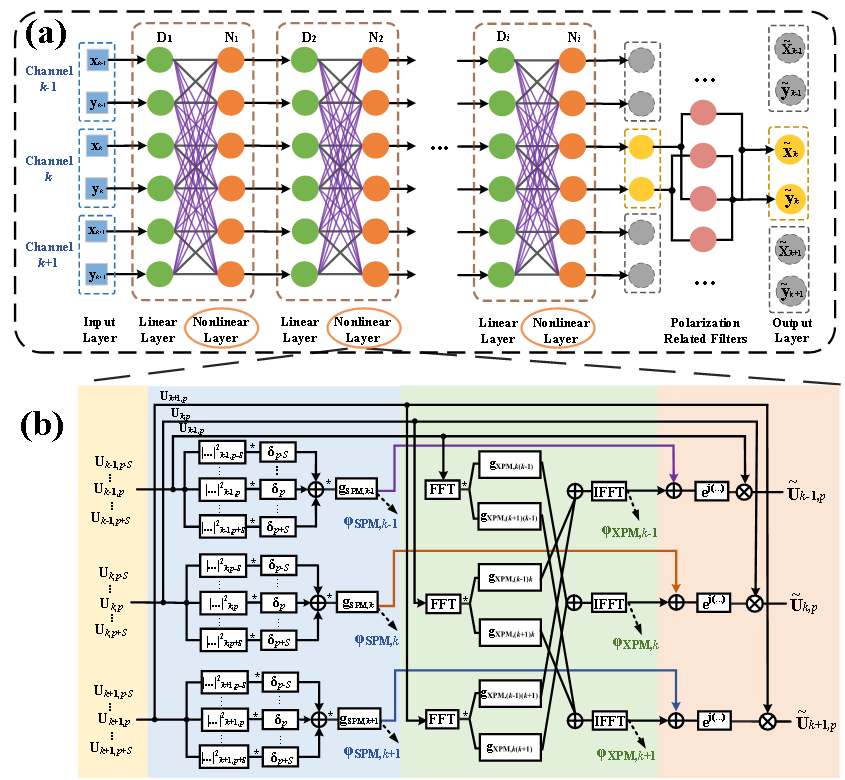 这项世界杯体育官方网站作改进了学习数字反向传播(LDBP),并提出了一种用于PDM-WDM系统的信道内和信道间非线性联合补偿新方案。该方案从可解释神经网络的角度出发,实现了基于物理模型的色散和非线性的交替补偿。色散补偿采用时域上的一维卷积运算,此外还在重叠保留方法中引入了脉冲展宽效应。对于非线性补偿,采用改进的联合模型,考虑了色散引起的信道内脉冲展宽和不同信道之间的走离效应对非线性效应的影响。在这项世界杯体育官方网站作中,通过仿真和实验验证了所提方案的有效性,结果表明与经典DBP相比,所提方案在性能提升的同时也能降低计算复杂度。