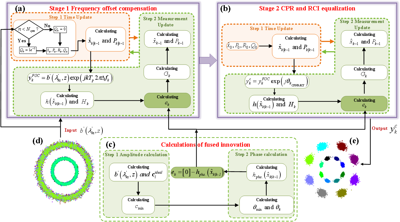 针对频率偏移(Frequency offset,FO)、载波相位噪声(carrier phase noise,CPN)和残余信道损伤(residual channel impairment,RCI)三种损伤的联合均衡问题,该世界杯体育官方网站作推导出了DS-NFDM 16/64APSK系统的联合损伤模型,并提出了一种基于两级级联扩展卡尔曼滤波器(two-stage cascaded extended Kalman filter,TSC-EKF)的联合均衡方案。该方案在第一级使用1024个符号跟踪频率偏移(Frequency offset,FO),随后在第二级执行载波相位恢复(carrier phase recovery,CPR)和残余信道损伤(residual channel impairment,RCI)均衡。更重要的是,该方案根据巧妙地融合了接收符号与理想16/64APSK星座点之间的最小欧氏距离和相位差,从而计算出两级级联扩展卡尔曼滤波器(two-stage cascaded extended Kalman filter,TSC-EKF)的新息。其仿真和实验结果表明,当达到7%的硬决策前向纠错(hard decision forward error correction,HD-FEC)阈值时,两级级联扩展卡尔曼滤波器(two-stage cascaded extended Kalman filter,TSC-EKF)方案可联合均衡的最大频偏估计范围和线宽的容忍度分别是FFT-Like+M-th power方案的9.6倍和3.3倍。此外,在复杂度仅为NFD+M-th功率方案的63.4%的情况下,两级级联扩展卡尔曼滤波器(two-stage cascaded extended Kalman filter,TSC-EKF)方案的FOE范围和LW容限可分别提高20%和233%。